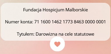 Kochani! W związku z licznymi zapytaniami o możliwość przekazania 1,5% podatku na rzecz Hospicjum Malborskiego, przekazujemy informację, iż będzie to możliwe dopiero po uzyskaniu przez Fundację statusu organizacji pożytku publicznego, co zgodnie z przepisami może